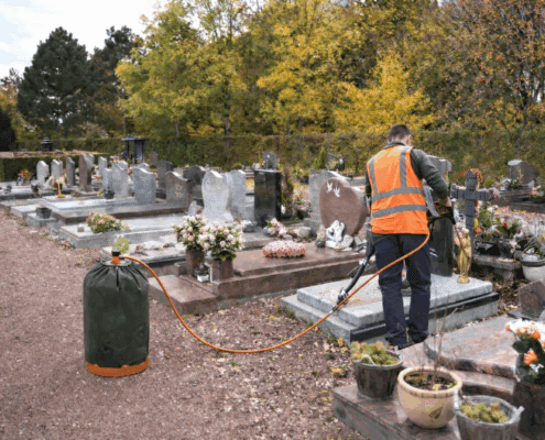 Les solutions de désherbage à air chaud pulsé RIPAGREEN ont été spécifiquement conçues pour intervenir dans les zones les plus étroites et sensibles des cimetières.